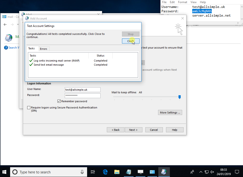 Username: (This will be your email address) Password: (This should be a secure password) Server Hostname: (This will generally be something.allsimple.net)